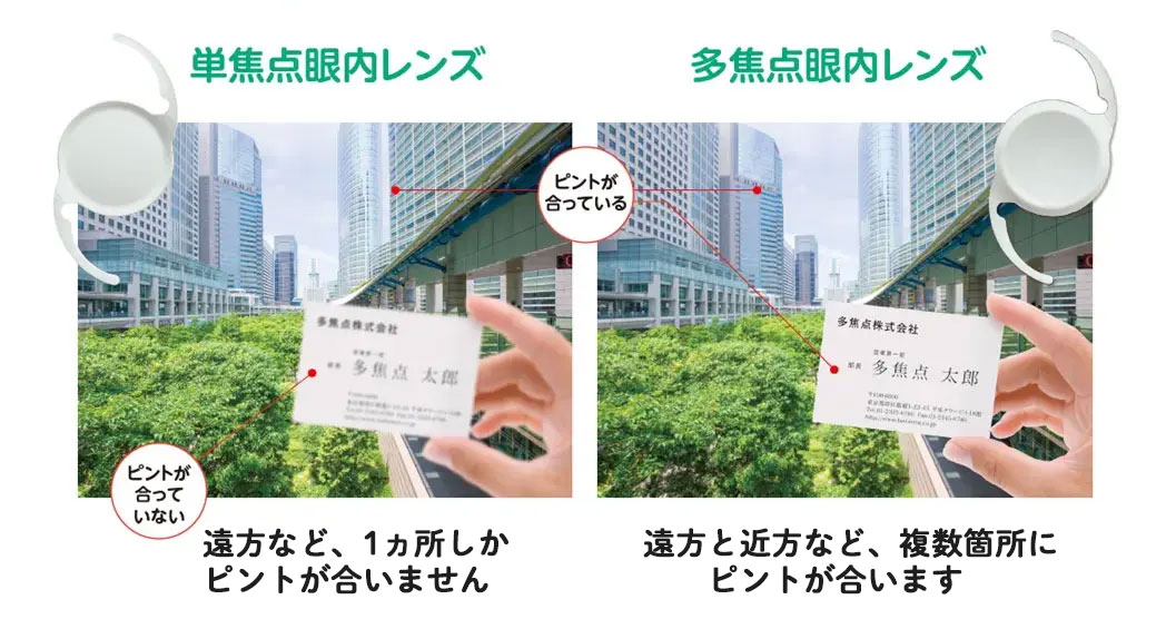 多焦点眼内レンズは2箇所、あるいは3箇所で焦点が合うレンズです。 複数箇所に焦点を分配することで幅広い距離を見ることが可能です。
